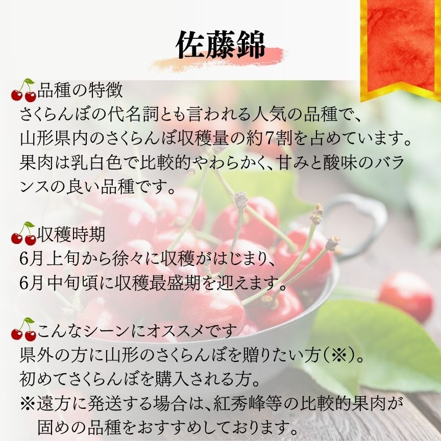 他の画像を見る 佐藤錦特選バラ詰(秀L) 500g 予約商品 送料無料 日付指定不可 クール便(冷蔵) ¥ 5,400 税込 販売期間 2026/04/02 0:00 〜 2026/05/31 23:59 詳細を見る お気に入りに登録する